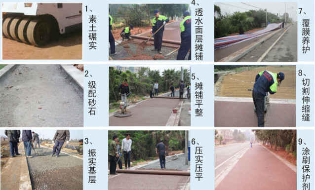 成品:透水地坪的澆水養(yǎng)護(hù)時間不少于7天。最后噴涂一層表面潤色封閉劑,使其在各方面達(dá)到趨于理想的效果。
