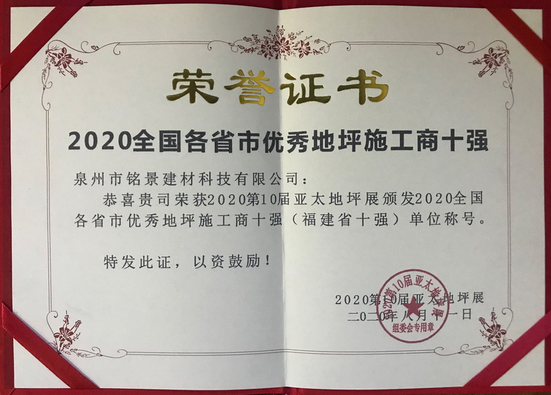 熱烈慶祝泉州市銘景建材科技有限公司榮獲2020全國各省市優(yōu)秀地坪施工商十強!
